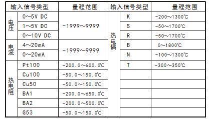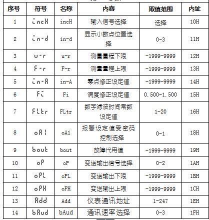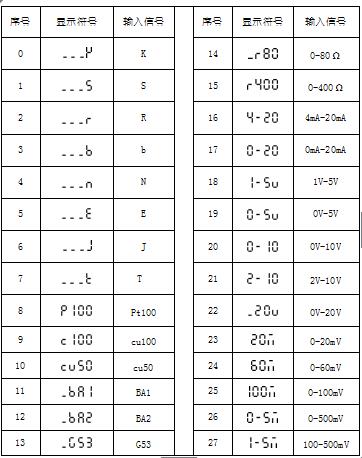 設(shè)定應(yīng)與儀表型號(hào)及實(shí)際輸入信號(hào)一致。該參數(shù)的值以符號(hào)形式表示,下表為對(duì)應(yīng)