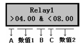 當編輯繼電器邏輯時,閃動的數(shù)字為當前可更改的數(shù)字。點▲/▼鍵,數(shù)字會變化,點OK鍵閃動光標會移到下一數(shù)字上。繼電器的邏輯是由“A、數(shù)值1、B、C、數(shù)值2”五部分組成。其中A和數(shù)值1,組成了繼電器吸合的前一個條件;C和數(shù)值2,組成了繼電器吸合的第二個條件。