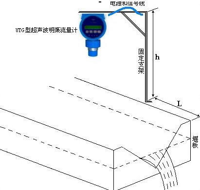 如圖所示,利用固定支架將TS-6000型超聲波明渠流量計安裝于被測液體正上方,儀表一般安裝在距堰板上游L=0.6~1.2m左右水流較平緩的地方,高度h=1.5m左右。電源及通信線通過鍍鋅鋼管連接到控制室。