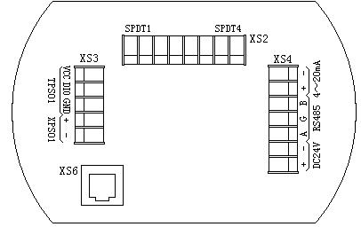 TS-6000型超聲波明渠流量計的對外接線板在TRS型現(xiàn)場變送器的后部,用戶只需逆時針擰開后蓋,即可看見如下圖所示的接口板: