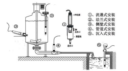 1、請不要把 pH電極直接投入水中,應使用電極安裝支架。各種電極安裝方式見圖。